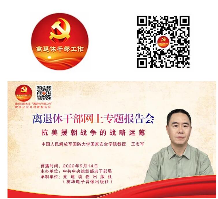 习近平总书记指出,抗美援朝战争伟大胜利,是中国人民站起来后屹立于世界东方的宣言书,是中华民族走向伟大复兴的重要里程碑,对中国和世界都有着重大而深远的意义。今年是中国人民解放军建军95周年,为组织引导广大离退休干部深入学习党史军史,进一步加强离退休干部思想政治建设,中央组织部老干部局通过“离退休干部工作”微信公众号,采取录播方式,举办第14场全国离退休干部网上专题报告会。