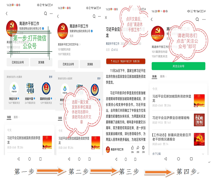 2.已经关注了“离退休干部工作”微信公众号的二级单位负责离退休工作的教师,在微信公众号中选择一篇文章发到本单位离退休老师群中,按照如下1至4步操作即可(简单说:就是负责教师选一篇文章转发到离退休教师群中,请老同志们点击打开后关注“离退休干部工作”微信公众号)。